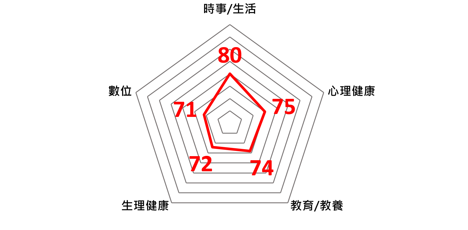 今年度「保誠兒童幸福指數」調查報告顯示,台灣兒童的幸福指數達75分(滿分為100)。在指數組成的各面向中,以「時事/生活教育」80分表現最突出,其餘為「心理健康」指數75分、「教育/教養相關」指數74分、「生理健康」指數則是72分,本次也特別挑出與數位、3C相關的內容,整合計算出「數位生活指數」,結果71分略低於其他面向,惟整體而言台灣孩子的幸福程度評別屬「幸福」。