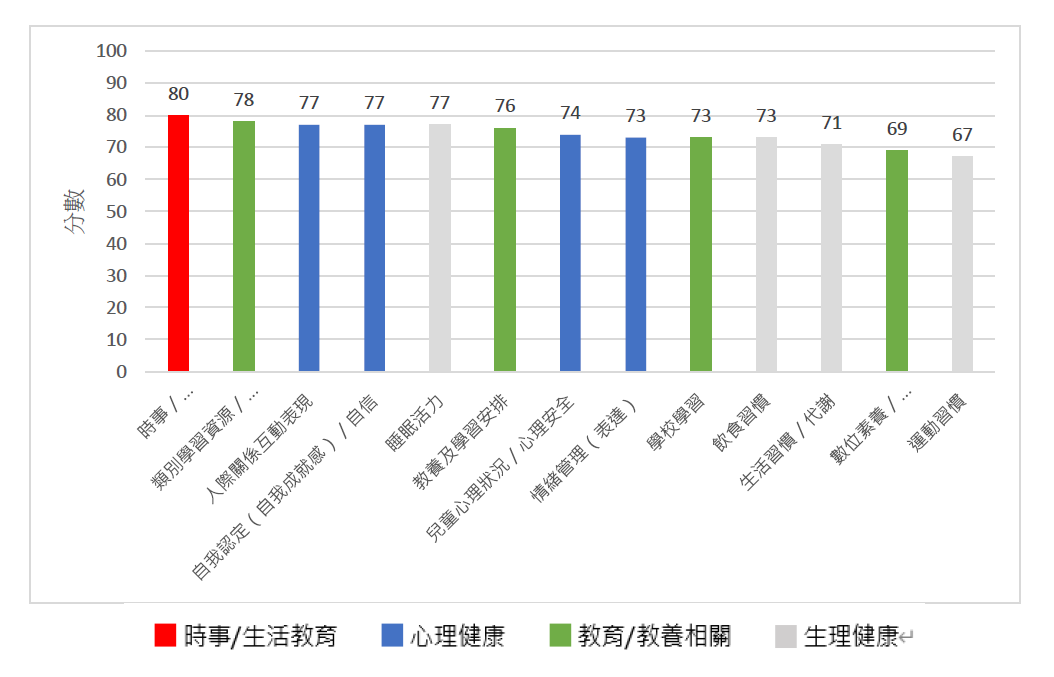 進一步分析各面向中表現最好的指標,分別為「學習資源/課後輔導」78分、「人際關係互動表現」77分,及「自我成就感」77分,顯示台灣孩子獲得足夠的學習協助及資源支持,人際互動表現良好,自我肯定的同時也能積極學習新事物。表現較差的則為「運動習慣」、「數位素養/使用3C習慣」,這兩項皆未達70分。值得注意的是,在「數位生活指數」當中,關於「網路使用安全教育」和「軟硬體設備足以支援兒童學習」兩項拿到79分的高分,顯見台灣的孩子享有相當充分的數位資源,惟「3C成癮症」和「護眼行動」兩個項目僅在及格邊緣,提醒我們3C成癮對兒童健康的影響仍須各界持續關注。